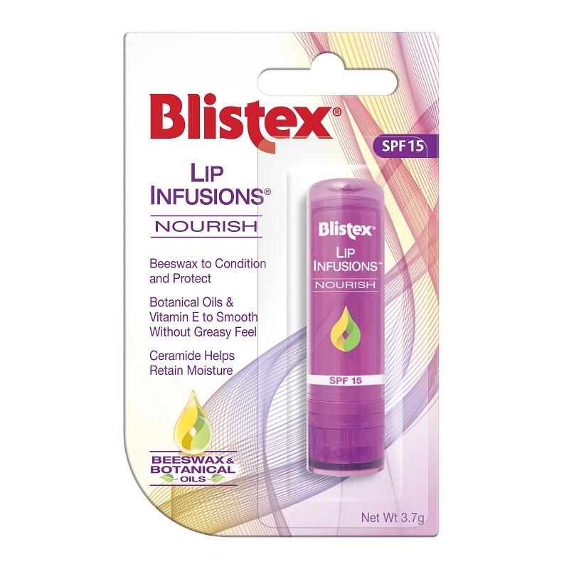 Blistex Lip Infusions Nourish Advanced lip care formula delivers concentrated nourishment for luxuriously smooth lips.? Infused with beeswax, a blend of botanical oils and vitamin E to soften without leaving an oily feel. Beeswax to condition and protect Botanical Oils and Vitamin E to Smooth without greasy feel Ceramide helps retain moisture