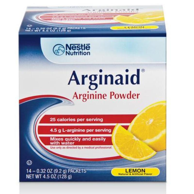 RESOURCE ARGINAID Drink Mix is an arginine-intensive powder formulated for patients recovering from burns, surgery, or chronic wounds. Each serving contains 4.5 g of L-arginine along with supplemental vitamins C and E. RESOURCE ARGINAID mixes easily with water .