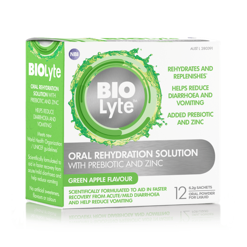 BIOLyte – Rehydrate & Replenish! When a stomach bug strikes one person in the household, it’s often quick to spread across all members leaving the whole family feeling wiped out. Gastro not only leaves us feeling weak and dehydrated, it also disturbs the healthy flora in our gut, which balances our digestive system. Rehydrate AND restore your gut back to normal with our revolutionary BIOLyte Solutions. Our revolutionary formula does more than just rehydrate – it reduces vomiting and diarrhoea and boosts your immunity. This winning formula contains a prebiotic that helps stimulate the healthy bacteria, which restores healthy gut function. Plus, BIOLyte replenishes the zinc in our systems, which is a key mineral affected by diarrhoea and vomiting. What’s more, our scientifically-formulated product is safe for the whole family to use and is available in a delicious drink with flavours including Red Grape, Orange & Green Apple. Exercising and hot weather conditions can also lead to dehydration due to a loss of fluids and electrolytes. When this occurs, you are more likely to suffer from tiredness and dizziness which stops you from performing at peak performance levels. BIOLyte helps you restore these lost electrolytes through its rehydration solution so that you can quickly get back to your best. Added Prebiotic Helps reduce diarrhoea and vomiting Meets new WHO/UNICEF guidelines Replenishes Zinc & Electrolytes Aids in FASTER recovery from Gastro. AUST L 280391