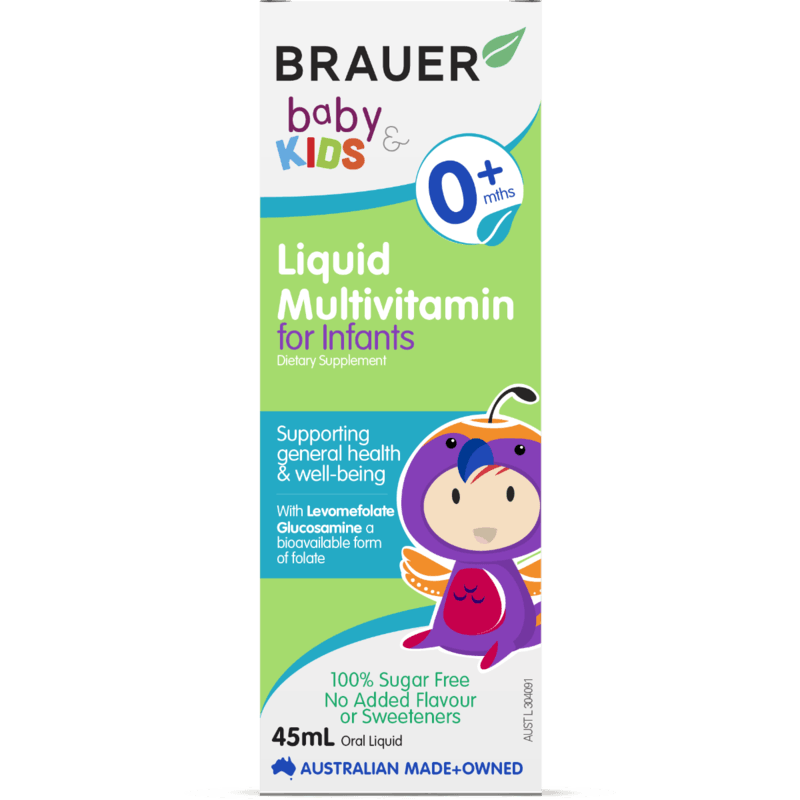 The Brauer Baby & Kids Liquid Multivitamin for Infants is 100% sugar free, with no added flavours or sweeteners. It contains 13 forms of essential vitamins and nutrients, with the more active forms of folate, vitamin B6 and vitamin B12.