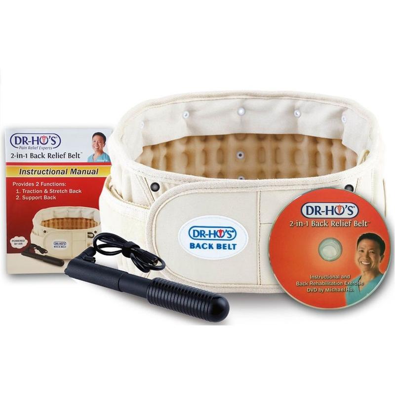 The DR-HO’S 2-in-1 Decompression Belt provides support, clinical grade traction and decompression therapy in one easy to use device. The decompression belt stretches and tractions the lower back as it inflates with air. This gentle traction helps decompress the spinal discs. Decompression helps relieve pressure off pinched nerves, degenerative, herniated and bulging discs. Relieving the pressure allows degenerative discs to get the water, oxygen and nutrients it requires for faster healing. It permits herniated and bulging discs to return to their normal position and condition. Reducing the constriction on pinched nerves such as the sciatic nerve helps relieve shooting leg pain. Features: For men & women Powered by air Stretches lower back & provides strong support Fits comfortable under clothing Pack contents:? Back Relief Belt Travel sized hand pump Instructional & back rehabilitation DVD Ideal for use while: Standing Sitting & driving Bending & lifting Lying down ARTG:224536