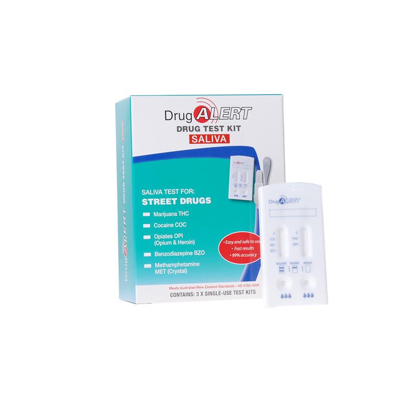 Drug Alert Saliva Test Kit X 3 can test for street drugs, marijuana THC, cocaine COC, opiates OPI (Opium & Heroin), benzodiazepine BZO, and methamphetamines (MET) crystal. Warnings & Disclaimers: Do not use after expiration date.
