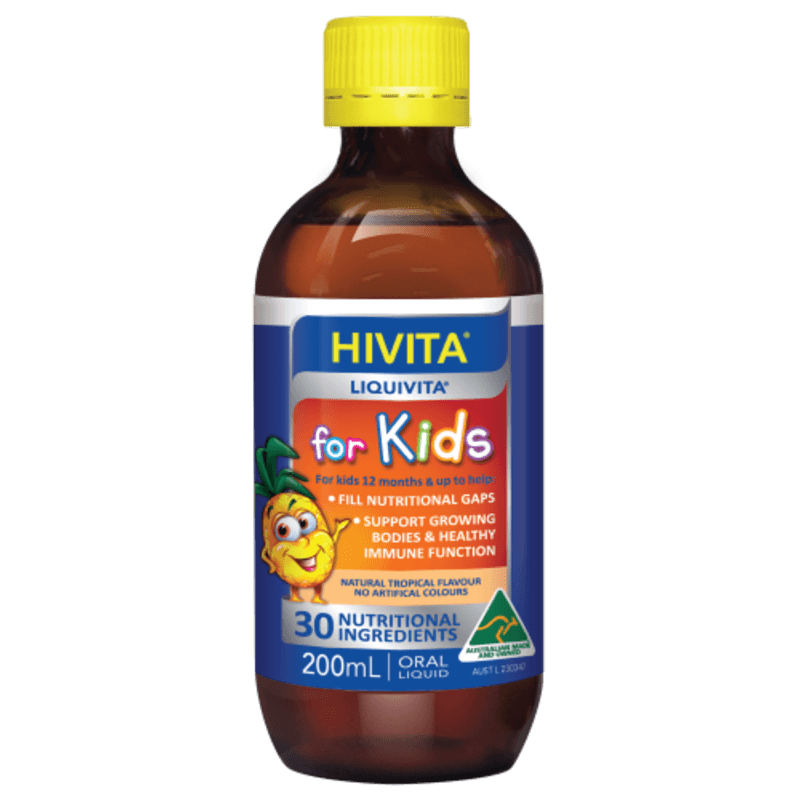 Formulated for fussy eaters, Hivita Liquivita for Kids is the naturally delicious way to fill nutritional gaps for kids aged two years and over. 30 nutritional ingredients Supports healthy growth and development Maintains healthy teeth, gums and skin Supports healthy immune function Helps fill nutritional gaps No added sucrose or glucose No artificial colours or flavours Ingredients Vitamins Active Ingredients per 10ML(2 metric teaspoons) (Vitamin A ) – Retinyl palmitate(equiv. to Vitamin A 200 IU) 60 mcg R.E. (Retinol Equivalents) Vitamin B1-B12 (B1) – Thiamine hydrochloride(equiv. to Thiamine 8.92mg) 10mg (B2) – Riboflavin sodium phosphate(equiv. to Riboflavin 2.92mg ) 4mg (B3) – as Nicotinamide 7mg (B3) – as Nicotinic acid 4mg (B5) – Calcium pantothenate(equiv. to Pantothenic acid 9.16mg and Calcium 840mcg) 10mg (B6) – Pyridoxine hydrochloride(equiv. to Pyridoxine 4.11mg) 5mg (B9) – Folic acid 100mcg (B12) – Cyanocobalamin 20mcg (Vitamin B cofactor) – Choline bitartrate 4mg (Vitamin C) – Ascorbic Acid 20mg (Vitamin D3) – Cholecalciferol(equiv. to Vitamin D3 40IU) 1mcg Minerals Calcium gluconate(equiv. to Calcium 357mcg) 4mg Cupric sulfate pentahydate(equiv. to Copper 1.27mcg) 5mcg Ferrous sulfate-dried(equiv. to Iron 1.64mcg) 5mcg Magnesium aspartate(equiv. to Magnesium 320mcg) 4.58mg Manganese sulfate monohydrate(equiv. to Manganese 325mcg) 1mg Potassium aspartate(equiv.to Potassium 800mcg) 3.81mg Zinc sulfate monohydrate(equiv. to Zinc 364mcg) 1mg Amino Acids Lysine hydrochloride 150mg Cysteine hydrochloride 2mg Glutamine 2mg Herbs Agrimonia eupatoria tincture (Agrimony) (equiv. to dry herb 1.25mg) Arctium lappa tincture (Burdock) (equiv. to dry root 1.25mg ) Euphorbia hirta tincture (Asthma herb) (equiv. to dry herb 1.25mg) Grindelia camporum tincture(Grindelia) (equiv. to dry herb 1.25mg) Humulus lupulus tincture (Hops) (equiv. to dry fruit 1.25mg) Marrubium vulgare tincture (White Horehound) (equiv. to dry herb 1.25mg) Thymus vulgaris tincture (Thyme) (equiv. to dry herb 1.25 mg Trifolium pratense tincture (Red Clover) (equiv. to dry flower 1.25mg) Free from yeast, wheat, gluten, egg, fish, artificial colours and artificial flavours. TGA Listing: AUST L 155042 Directions Dosage and directions for useChildren 2 – 17 years: 5mL (1 metric teaspoon) 2 times daily before meals, or as directed by your healthcare professional. Shake well before use. Always read the label. Use strictly as directed. If symptoms persist consult your healthcare professional. Vitamins can only be of assistance if dietary vitamin intake is inadequate. Vitamin supplements should not replace a balanced diet. Storage Store below 30°C in a dry place away from sunlight.Do not use if cap seal is broken. Warnings If you are pregnant or considering becoming pregnant, do not take a vitamin A supplement without consulting your doctor or pharmacist. The recommended daily amount of vitamin A from all sources is 700 micrograms retinol equivalents for women and 900 micrograms retinol equivalents for men. When taken in excess of 3000 micrograms retinol equivalents, vitamin A can cause birth defects. Contains sodium benzoate. Products containing sorbitol may have a laxative effect or cause diarrhoea. Who Will Benefit? Children who do not have an optimal diet or digestive function, or who are on gluten-free diets. Children who are unable to swallow tableted supplements. Children who need help to fill nutritional gaps in order to support the body, especially when recovering from minor infectious illness such as cold and flu. Children who require assistance in the maintenance of general wellbeing Children that attend childcare or school who need support for healthy immune functions and metabolism. HIVITA® LiquiVita® for Kids contains important ingredients for the metabolism of carbohydrates, proteins and fats. Children predominantly eating supermarket quality or packaged/frozen/take-away foods. HIVITA® LiquiVita® for Kids may be taken as a daily nutritional supplement to help provide essential nutrients. Evidence Balch, P.A. (2010) Prescription for Nutritional Healing, Penguin Group. Braun, L., Cohen, M. (2010) Vitamin B1, Folic acid, Vitamin B12, Vitamin B3, Vitamin B5, Riboflavin, Vitamin B6, Vitamin C, Herbs and Natural Supplements An Evidence-based Guide, Churchill Livingstone Elsevier. Dusitanond, P., et.al. (2005) Vitamin B12, Homocysteine-Lowering Treatment with Folic acid, cobalamin, and Pyridoxine, Stroke. Hendler, S.S. (2008) Vitamin C, Folic acid, Vitamin B3, Vitamin B1, Riboflavin, Vitamin B12, Vitamin B6, PDR for Nutritional Supplements, Thomson Reuters. Higdon, J. (2003) Folic acid, Vitamin B12, Vitamin B3, Vitamin B5, Riboflavin, Vitamin B6,Vitamin C, An Evidence-Based Approach to Vitamins and Minerals, Thieme. NHMRC (2006) Vitamin B12, Vitamin B5, Vitamin B1, Vitamin B6, Nutrient Reference Values for Australia and New Zealand, National Health and Medical Research Council. Osiecki, H. (2007) Vitamin B5, The Nutrient Bible, Bio Concepts. //