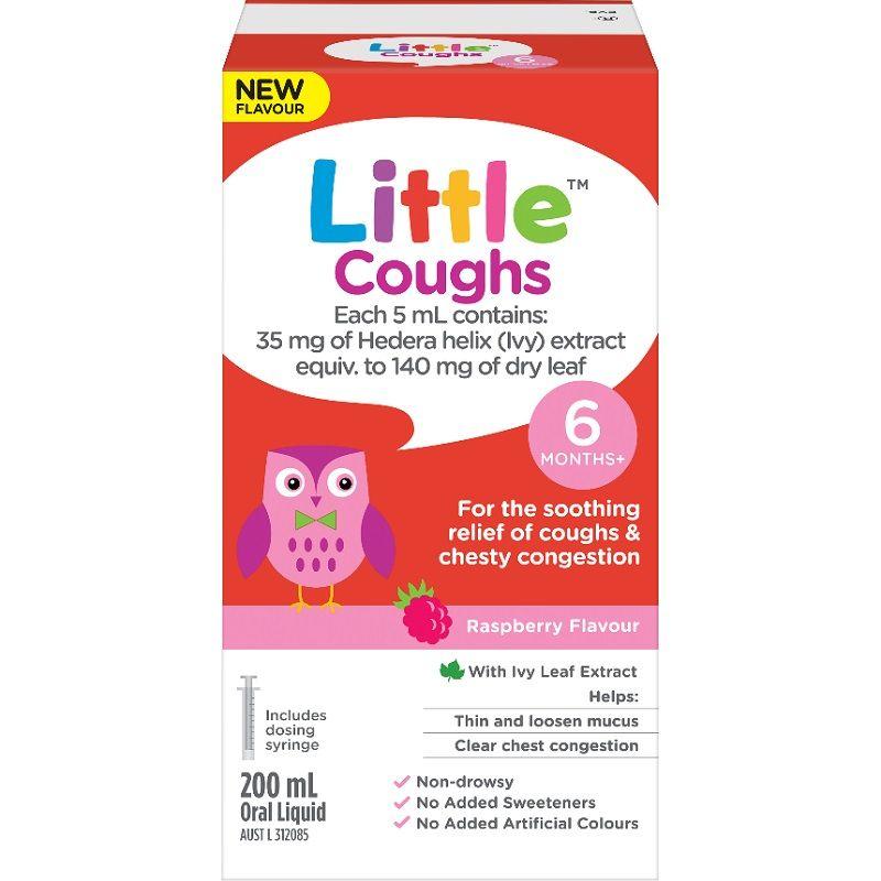 Little Coughs Raspberry is a pleasant tasting cough syrup based on an extract of ivy leaf which acts as an expectorant helping to thin and loosen mucus making it easier to help clear the chest of congestion. It provides soothing relief of coughs and respiratory congestion for the whole family. Non-drowsy No Added Sweeteners, Artificial Colours, Gluten, Wheat or Lactose. AUST L?312085