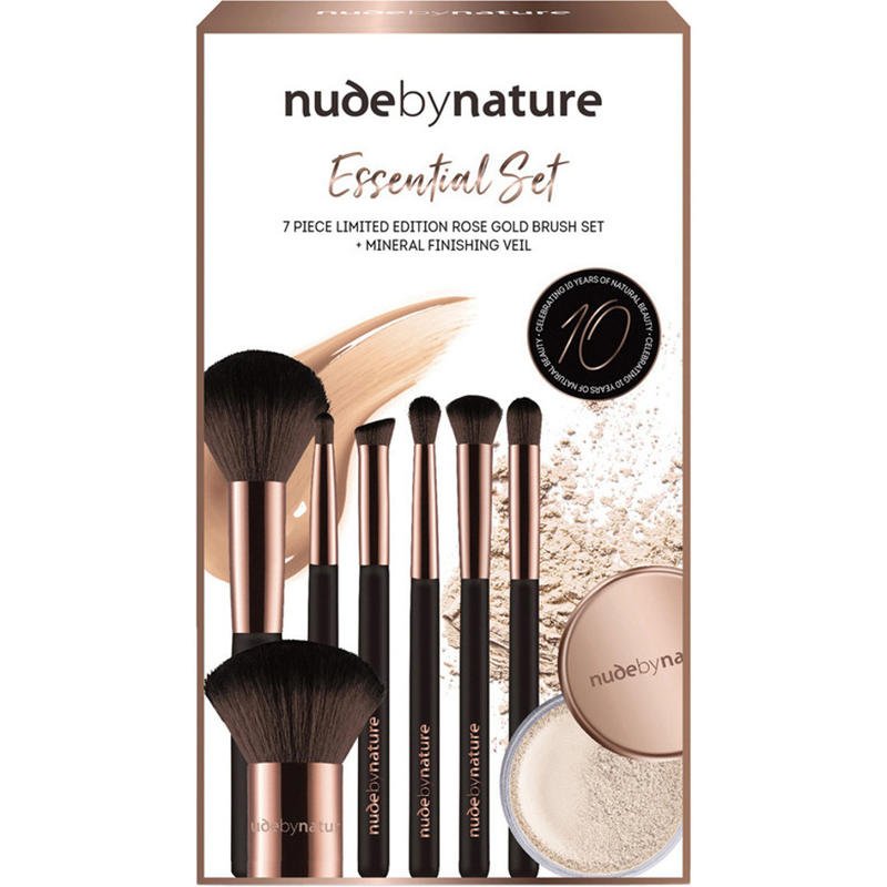 Nude By Nature 十周年限量版精美化妆刷套装包含:遮瑕刷、散粉刷、粉底刷、眼影刷、定妆粉刷、腮红刷、唇刷等这七个多功能和易于使用的刷子和矿物质定妆散粉 2g。