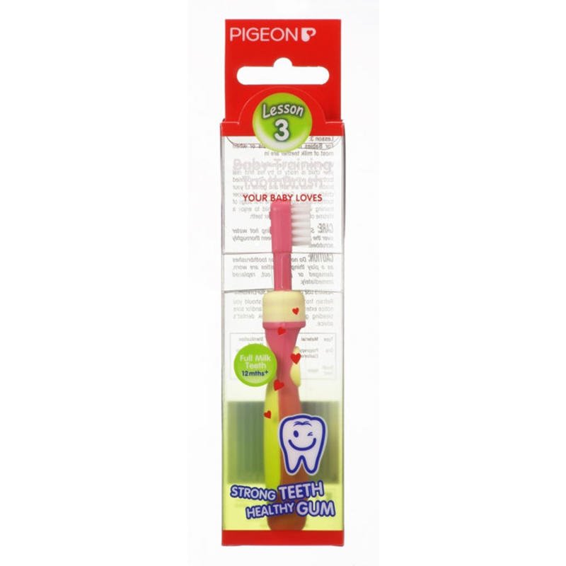 Pigeon 贝亲 幼儿训练牙刷 第3段(适合12个月以上婴幼儿/清洁婴幼儿的牙龈和乳牙)根据儿童手掌大小发育规律,设计刷柄的长度,让宝宝更易掌控。使用防滑加强设计,让宝宝自然掌握刷牙的正确姿势。针对宝宝稚嫩的牙龈,特意配上特柔软的刷毛帮助清洁小牙齿和牙龈保护,是一支既可以有效地清洁宝宝牙齿,又可以有效地保护宝宝的牙龈不受伤害的软毛刷。配上卡通,色彩鲜艳的包装,让宝宝更喜欢刷牙。