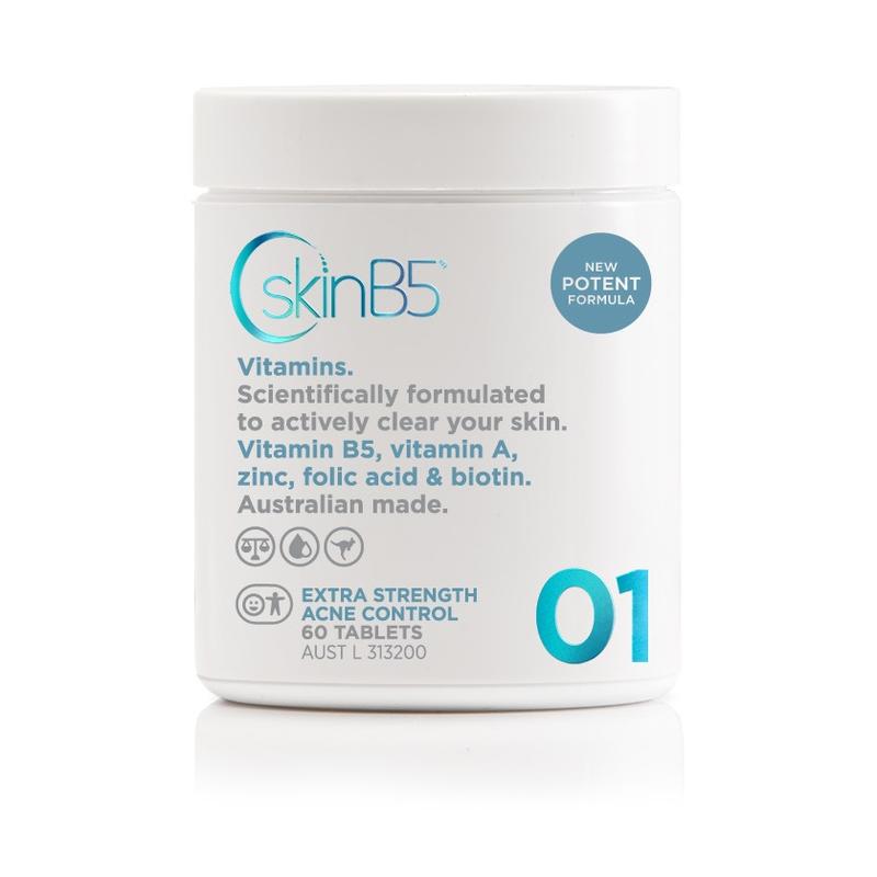 SkinB5 Extra Strength Acne Control Vitamin Tablets Scientifically formulated to actively clear your skin. Vitamin B5, vitamin A, zinc, folic acid & biotin. Australian made. AUST L 313200