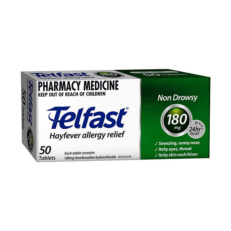 Fast, non drowsy relief of the symptoms of hayfever allergies and itchy skin rash or hives. With just one tablet a day you can get on with your day without worrying about your allergies.Use Telfast 180mg Tab X 50 for relief of the symptoms of hayfever allergies:SneezingRunny & Itchy NoseItchy & Watery EyesItchy ThroatRelief of the symptoms of itchy skin rash / hives (urticaria):Itchy Skin RashItch caused by HivesSwelling related to AllergySwelling related to Hives